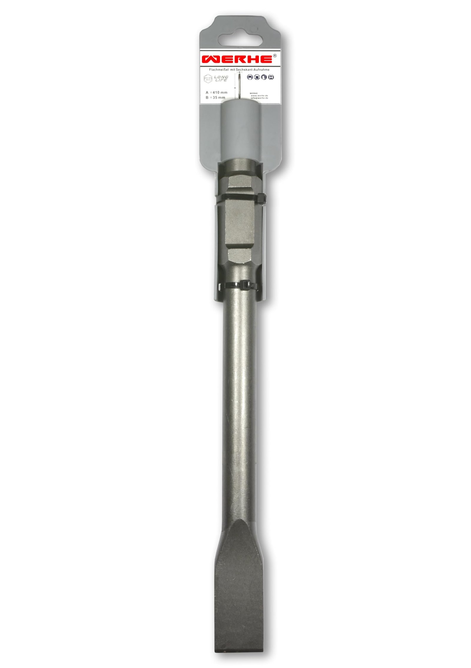 Flach Spat Spitz für Abbruchhammer mit sehr guten Eigenschaften | Für Meissel- und Abbrucharbeiten in Beton, Mauerwerk, Bodenbelägen | Optimal für sehr harte Oberflächen | 35mm, 50mm, Spitzmeißel 410 mm Länge, Aufnahme: SDS-HEX 30 mm (Sechskant)