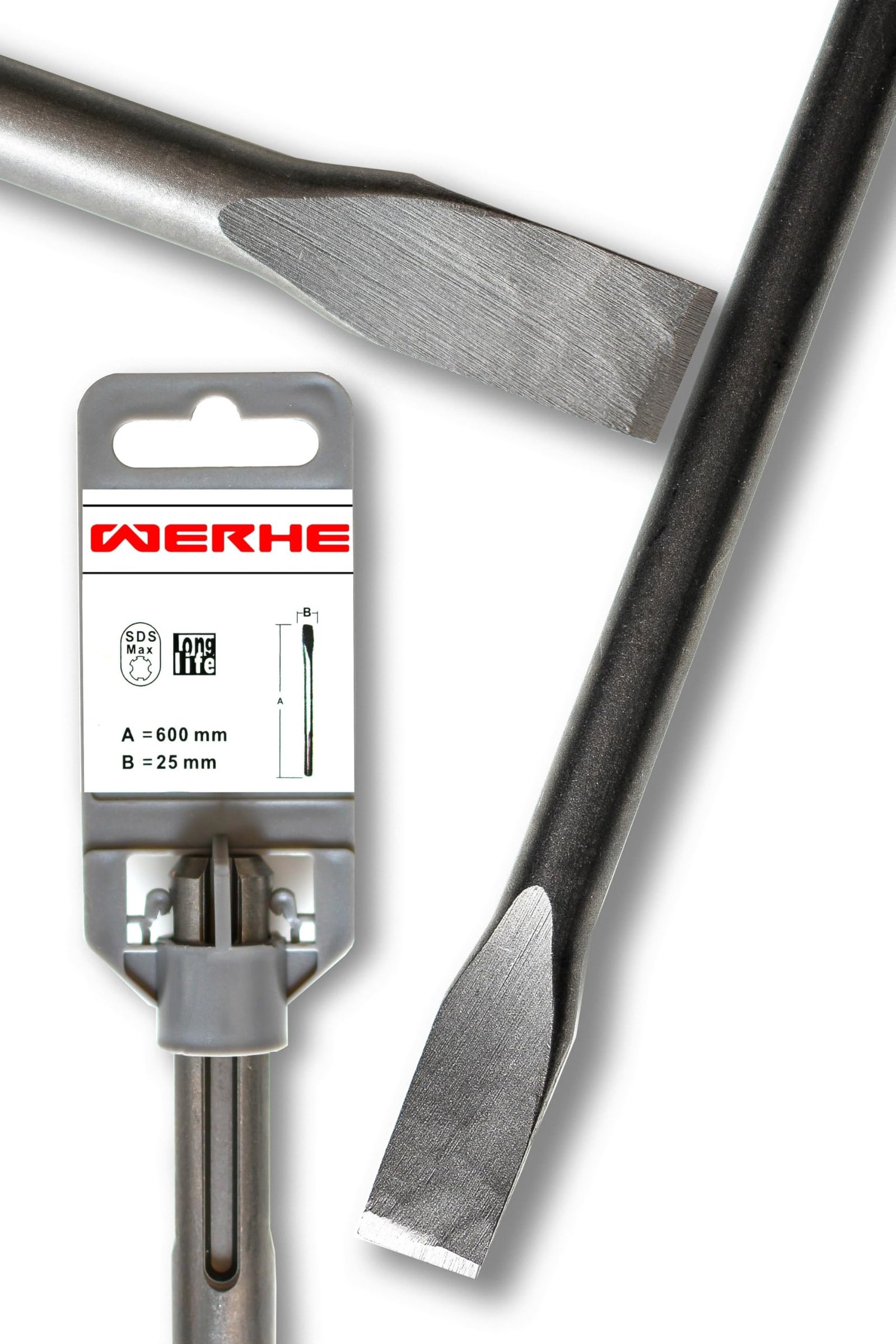 SDS Max aus gehärtetem Stahl | Für Arbeiten an Mauerwerk, Beton oder Bodenbelägen | Der Meißel kann mit allen Maschinen mit SDS Max Aufnahmen verwendet werden | Gesamtlänge: 600 mm, Breite: 25 mm